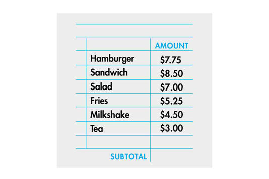 The students were to add the cost of these items together and calculate a 20% tip.